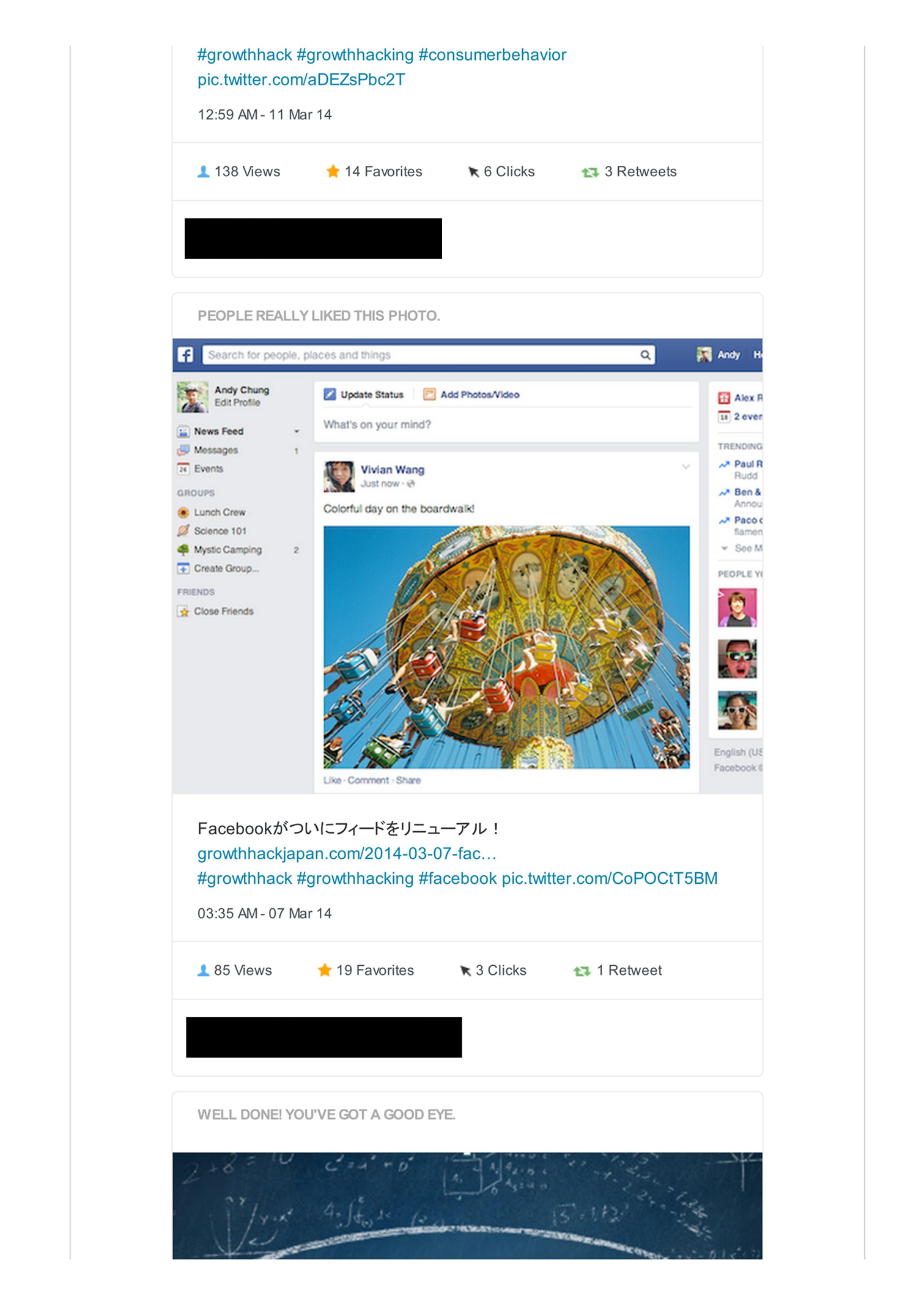 以下、Twitterからメール配信された、ページインサイトのスクリーンショットです(3枚に分けてスクショを撮ってます)。見た目に分かりやすく、直感的にマーケティング効果を把握できるシンプルなデザインに注目です!